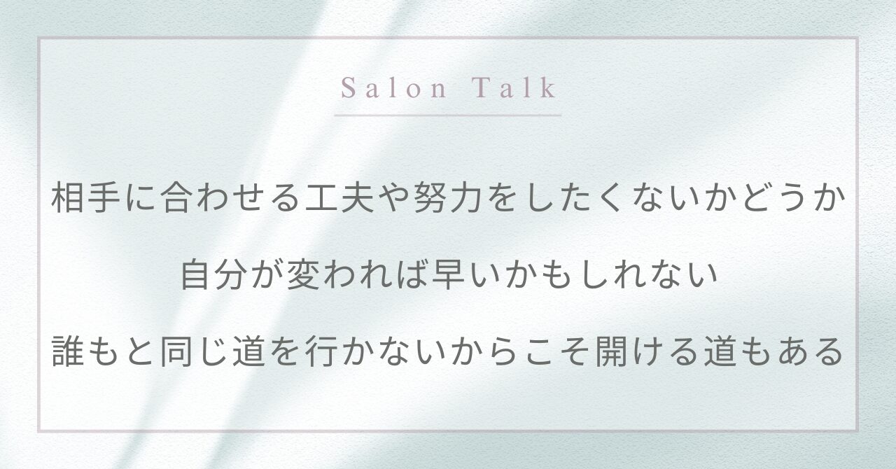 『結婚相談所の婚活メソッド/合理的アプローチへの違和感/「自分に合う」相手探し??/人生の最短距離 など』サロントーク2025.12②(約4538文字) このコンテンツを閲覧するにはログインが必要です。お願い Log In. あなたは会員ですか ? 会員について Post date 2025年12月26日 Posted in 書き起こしまとめ Previous post: サロントークご案内板 Next post: [Self-Question]2026.1.1 #一年の土台をつくる“最初の設計”の1ヶ月① コメントを投稿するにはログインしてください。